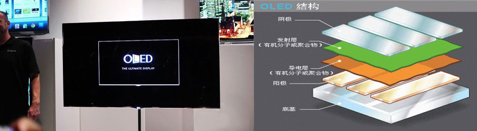OLED的基本結構是由一薄而透明具半導體特性之銦錫氧化物(ITO),與電力之正極相連,再加上另一個金屬陰極,包成如三明治的結構。整個結構層中包括了:空穴傳輸層(HTL)、發光層(EL)與電子傳輸層(ETL)。當電力供應至適當電壓時,正極空穴與陰極電荷就會在發光層中結合,產生光亮,依其配方不同產生紅、綠和藍RGB三原色,構成基本色彩。OLED的特性是自己發光,不像TFT LCD需要背光,因此可視度和亮度均高,其次是電壓需求低且省電效率高,加上反應快、重量輕、厚度薄,構造簡單,成本低等,被視為 21世紀最具前途的產品之一。