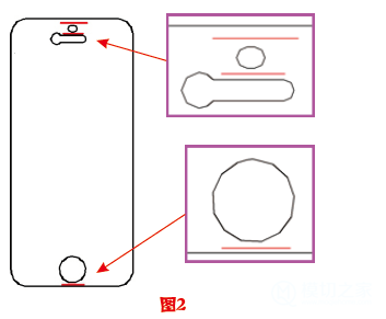 這里以Iphone5S的正面保護膜為例。圖2中的紅色部份為壓痕的重災區。要怎么來解決這個問題呢?