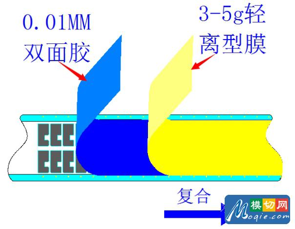 5 .第三工序用M O Q I E - 0 1 2 - C模具,全部半穿到離型膜,然后用復合機排掉手柄處的兩條廢料,同時復合透明硅膠保護膜。