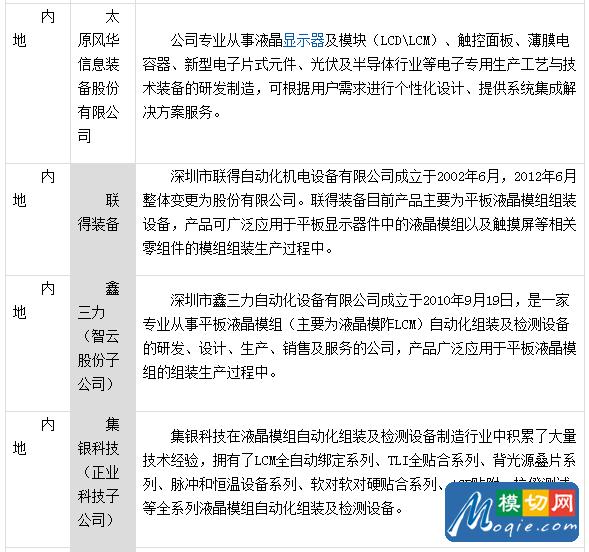 目前國內在模組段設備已經取得了較大的突破,在部分環節已經可以完全實現進口替代。我們判斷,AMOLED在模組段的工藝與LCM相似甚至更為簡單,在目前技術已經比較成熟的環境下,具備優質客戶資源的企業更容易獲得先發優勢。