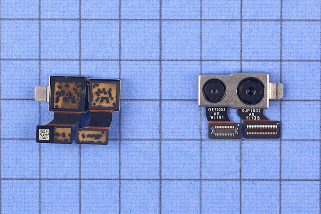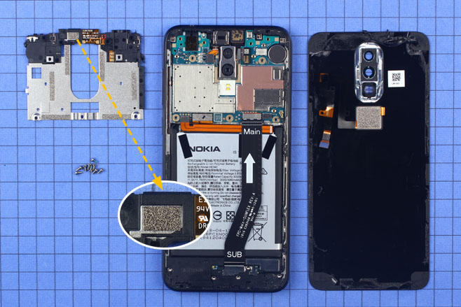 作為一臺千元機,諾基亞 X6 在攝像頭方面并沒有做太多的特別設計, 1600 萬像素 + 500 萬像素的后置雙攝以及前置的 1600 萬像素攝像頭在手機上部中間自下而上排布,為此,主板設計也因應攝像頭的排布而在中間至上方位置“鏤空”。