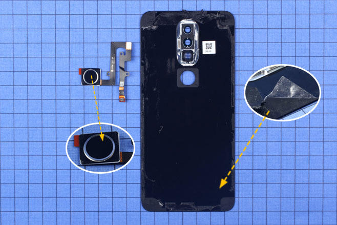 后蓋上貼有一層黑色塑料紙,指紋識別模塊按鍵通過黑色膠條固定。