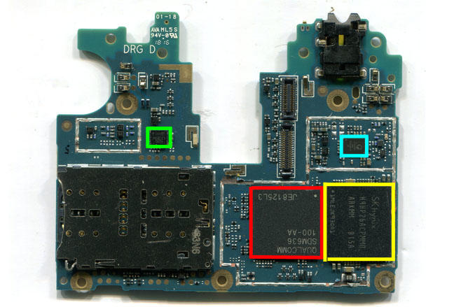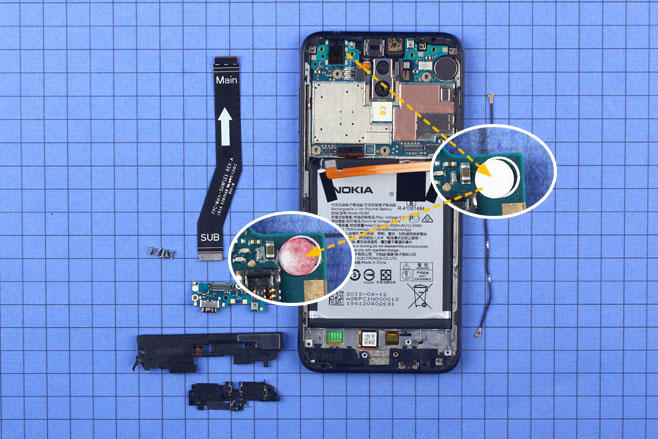 相比起其他智能手機,諾基亞 X6 的主板正面的元器件會比較少。這是主要是因為主板本身體積不大,加上正面要放置 SIM 卡槽所致。
