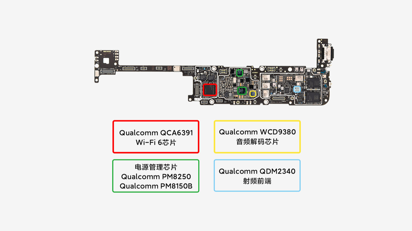 主板正面上部為全新加入的Wi-Fi6芯片,中部為電源管理芯片和音頻解碼,下部為射頻芯片。背面從上而下排布著高通驍龍865+LPDDR5閃充堆疊、X55基帶、UFS 3.0閃存。LPDDR5內(nèi)存讓讀寫速度大幅提升的同時還更省電,配合UFS 3.0可以為小米10 Pro提供目前頂尖的數(shù)據(jù)傳輸能力。