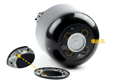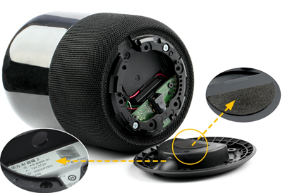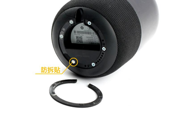 音箱底部防滑墊通過雙面膠固定,防滑墊為泡棉材料。防滑墊下方是5顆十字螺絲,其中一顆表面貼有防拆貼。