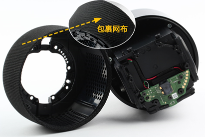 外殼內部為鏤空網狀ABS塑料,外部為飛織包裹網布。擰下音箱底部的兩顆十字螺絲,即可取下,音箱內部結構已經可以看到大概。