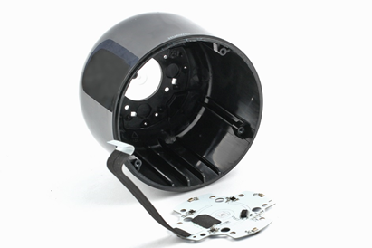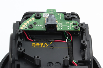 音腔與內支撐為一體式模塊設計,底部半月形的電源板,用兩顆十字螺絲固定在音腔殼體底部。電源板與相關器件之間的連接導線嵌在底部的理線槽中,導線外面均有海綿材料包裹。