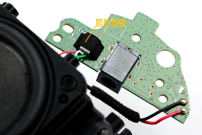 10W揚聲器和兩塊被動低音增強單元共使用12顆十字螺絲固定。揚聲器兩處接觸點與導線之間采用錫焊焊接方式連接,并且焊接點外用黑色膠布包裹。