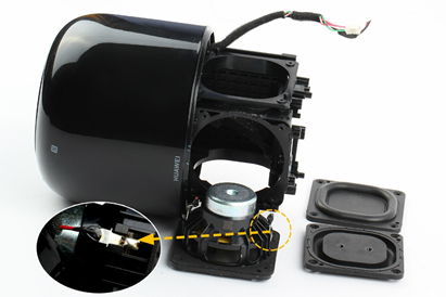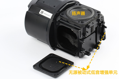 底部音腔的結構是一個鏤空模組,一面封閉,兩側各有一塊無源被動式低音增強單元,正前方為一個10W的2.25英寸全頻揚聲器。揚聲器的導線從塑料殼內,穿過模塊頂部的孔洞,與主板連接。