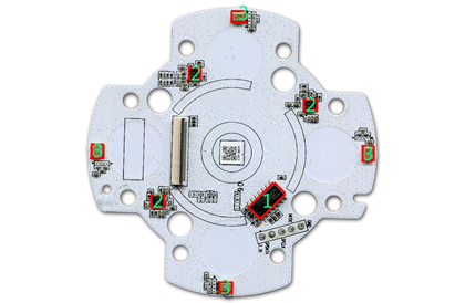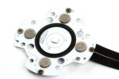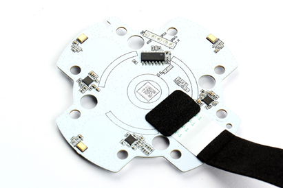 麥克風板采用白色PCB板材,四角有四顆歌爾的反向拾音麥克風組成收音陣列。正面麥克風拾音孔有硅膠套,主板正中間有一顆LED燈珠,外圍有一圈泡棉緩沖墊,四個觸控位置沒有實體按鍵,表面用四塊導電泡棉接觸主板銅皮產生電信號實現控制。