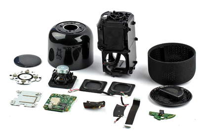 華為AI音箱2整個采用ABS工程塑料制造,上半部分使用鋼琴烤漆工藝,下半部分使用飛織網布包裹。音箱拆解較為復雜,整機內使用十字螺絲加雙面膠組裝部件,主板與各個部件之間大量使用導線連接,并且多處使用焊接工藝。