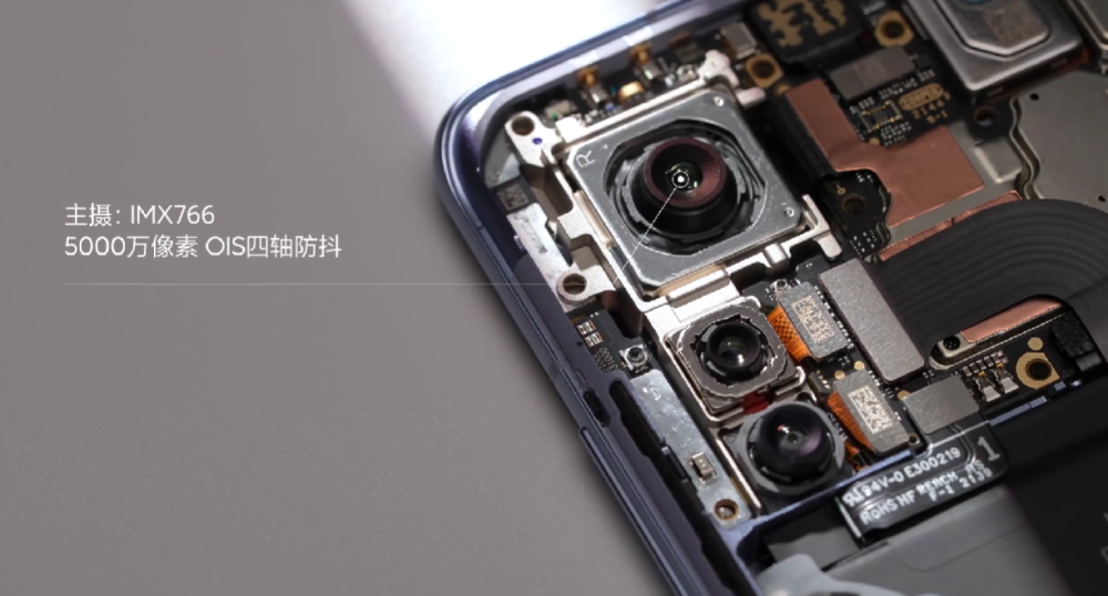 打開后蓋,映入眼簾的是無線充電圈,然后是后置5000萬像素主攝,采用了索尼IMX 766傳感器,體積相比另外兩顆鏡頭要大得多,支持OIS四軸防抖,以及一顆3200萬像素前攝。