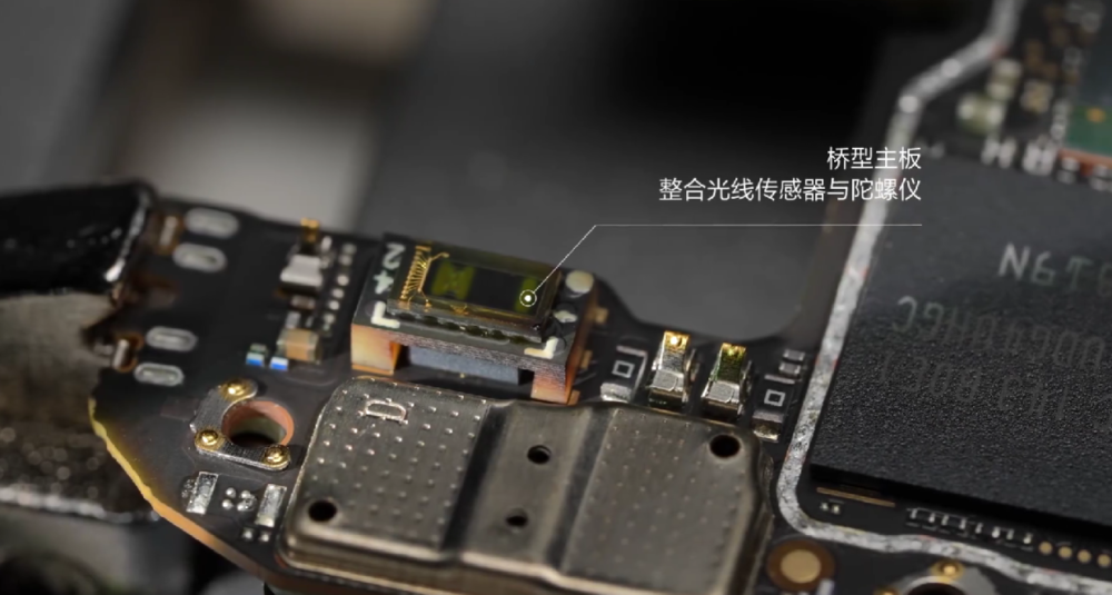 打開蓋板,是各種密密麻麻的元器件,其中包含01005小封裝器件、橋型主板整合光線傳感器和陀螺儀。