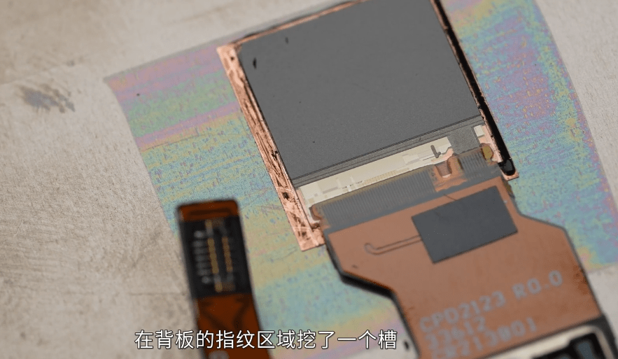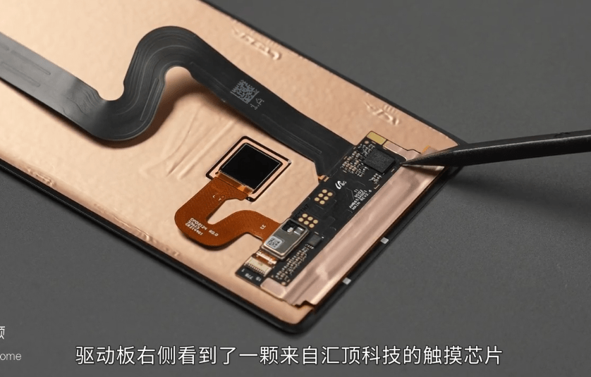 屏幕背面銅箔全覆蓋,我們可以看到3D超聲波指紋模組,以及驅動板右側的匯頂科技的觸摸芯片。