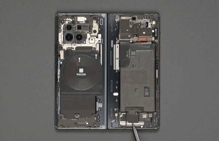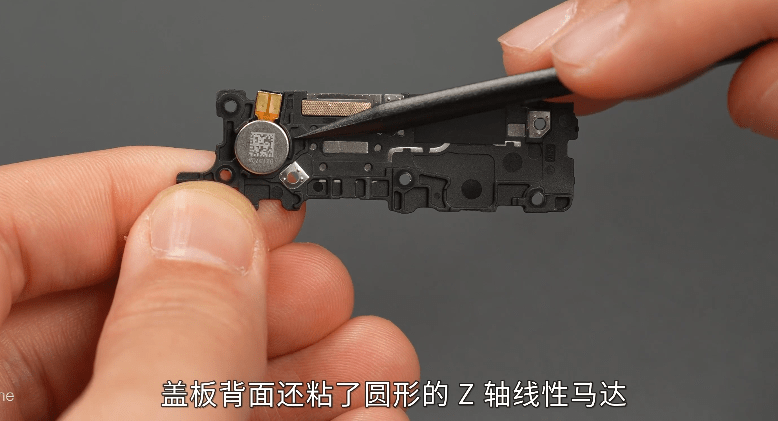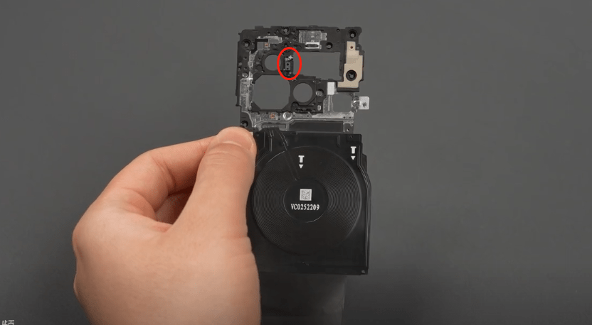 拆下左側的無線充電模塊,四周集成了NFC線圈,使其成為唯一一款支持50W無線快充的折疊屏手機。圖上紅標部件為激光對焦模組。