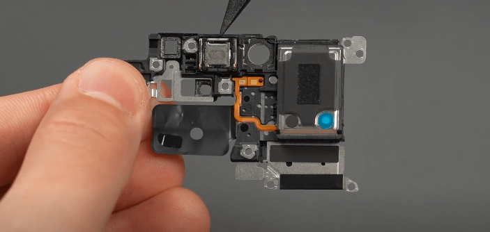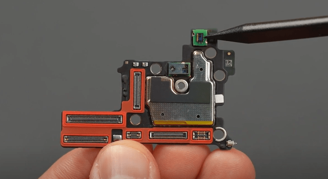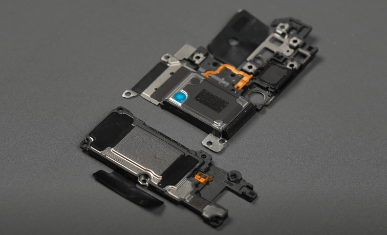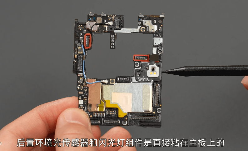 接口都有泡棉或膠圈保護,后置環境光傳感器和閃光燈組件時直接粘在主板上的,頂部麥克風和內屏的環境光傳感器為直接焊接,且麥克風背面還有防塵網設計。正反兩面屏蔽罩上均有散熱銅箔覆蓋。