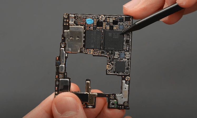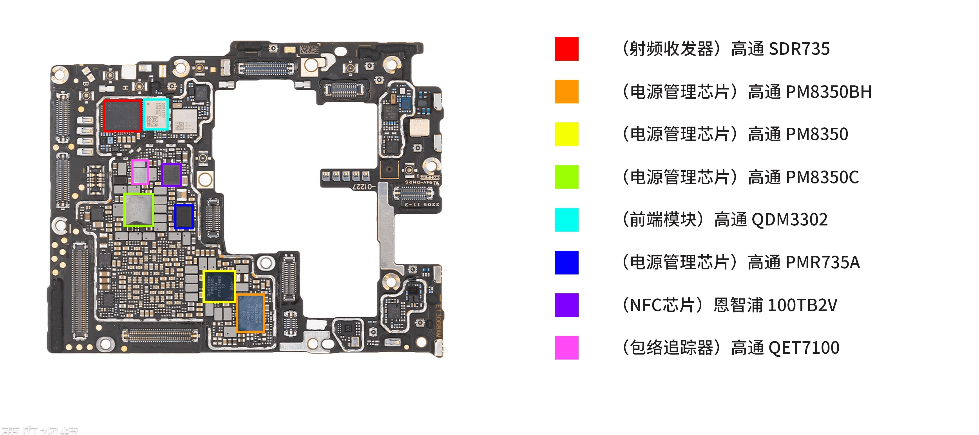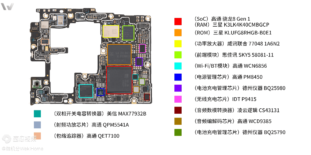 Ram為三星的LPDDR5規格,下方為高通驍龍8處理器,旁邊是三星UPS3.1的ROM。