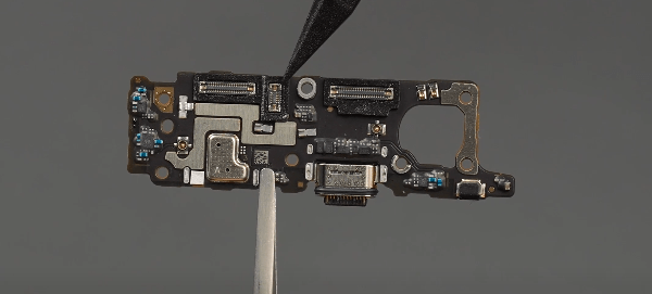 挑開副板上的3個BTB接口和2個同軸線接口,接口四周有緩沖泡棉保護,副板集成了Type-C、MIC和SIM卡卡槽,充電口內側有防塵防水膠圈。