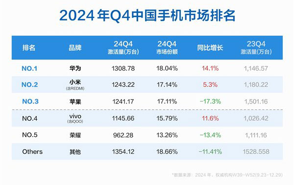 據權威市場調研機構數據顯示,2024年第四季度(W39-W52),按中國手機市場新機激活量最新排名,華為、小米占據前二,蘋果位列前三。