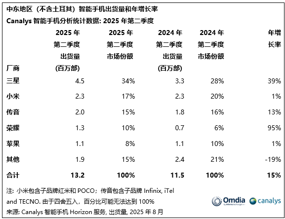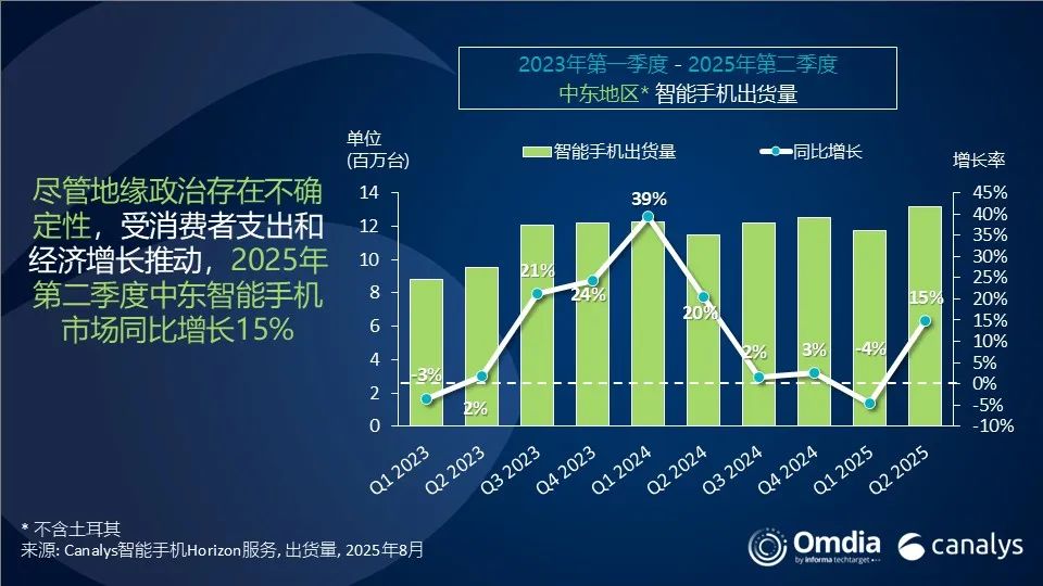 Canalys的最新研究顯示,2025年第二季度,中東(不含土耳其)智能手機(jī)市場(chǎng)出貨量同比增長(zhǎng)15%,達(dá)到1320萬(wàn)部,成為全球增長(zhǎng)最快的地區(qū)。此次反彈受益于注重性?xún)r(jià)比的消費(fèi)者、節(jié)日期間的消費(fèi)支出以及強(qiáng)勁的經(jīng)濟(jì)動(dòng)能,盡管地緣政治存在不確定性,該地區(qū)的智能手機(jī)出貨量依然有望持續(xù)增長(zhǎng)。