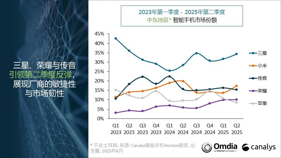 Canalys首席分析師Manish Pravinkumar表示:“2025年第二季度,中東智能手機(jī)市場(chǎng)錄得自2019年第二季度以來(lái)的最高季度出貨量,反映了該地區(qū)強(qiáng)勁且穩(wěn)定的需求。在第一季度市場(chǎng)表現(xiàn)低迷后,第二季度實(shí)現(xiàn)強(qiáng)勁反彈,得益于渠道補(bǔ)貨以及廠(chǎng)商更新中端產(chǎn)品線(xiàn)。對(duì)于許多廠(chǎng)商而言,中東已成為業(yè)務(wù)增長(zhǎng)的核心投資目標(biāo),這與該地區(qū)政府的宏偉愿景和基礎(chǔ)設(shè)施項(xiàng)目、居民可支配收入的上升、可覆蓋市場(chǎng)的擴(kuò)大以及經(jīng)濟(jì)多元化趨勢(shì)高度契合。隨著政治穩(wěn)定性改善、旅客持續(xù)涌入以及其全球商業(yè)樞紐的地位不斷鞏固,中東正逐步成為廠(chǎng)商在本地和國(guó)際市場(chǎng)取得成功的重要跳板。”