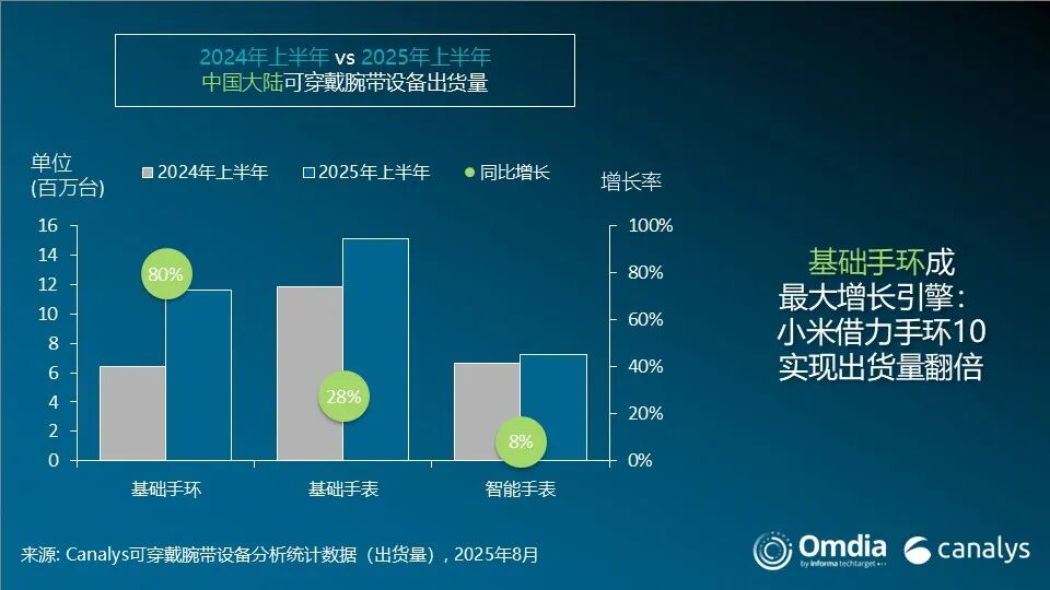 Canalys數(shù)據(jù)顯示,2025年上半年,中國(guó)大陸可穿戴腕帶設(shè)備出貨量達(dá)3390萬(wàn)臺(tái),同比增長(zhǎng)36%,繼2024年下半年33%的增長(zhǎng)后持續(xù)強(qiáng)勢(shì)攀升。這一增長(zhǎng)態(tài)勢(shì)創(chuàng)中國(guó)大陸可穿戴腕帶設(shè)備市場(chǎng)上半年度出貨量的歷史新高,標(biāo)志著市場(chǎng)進(jìn)入全新發(fā)展階段。