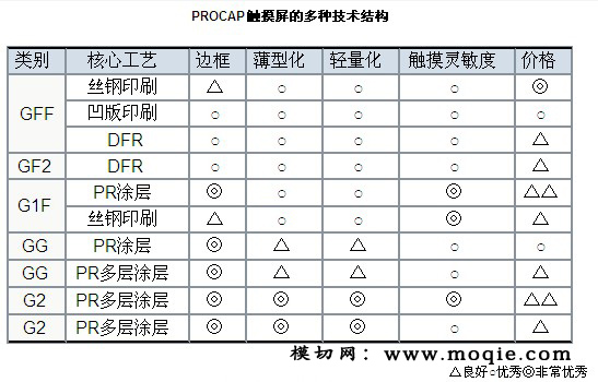 目前觸摸屏產業與產品,正處于從薄膜式(GFF)或玻璃式(GG)結構朝向G1F、G2、GF2以及多層結構的AMOLED On-cell技術發展的階段。GFF的最大優點在于初期投資規模較少,適合多款少批量生產,且有產品較輕的優點。GG結構適合大批量量產、且外觀特性較好,但也有初期投資規模大、與薄膜式觸摸屏產品相比較重的缺點。過去在觸摸屏產品領域GG與GFF式結構的觸摸屏為大眾,預計未來將慢慢向G1F、G2、AMOLED On-cell等新技術領域擴大。然而無論何種結構的觸摸屏,無法同時滿足面板企業與客戶等所有企業的要求,未來這些優缺各異的多種觸摸屏技術將并存,并形成多元化的應用產品市場。并在此過程中解決工藝與技術問題,成為左右每個企業競爭力的重要因素。