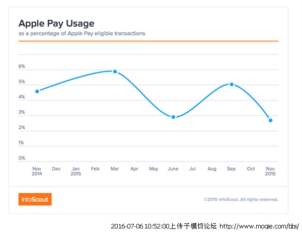 然而之后的**段時間我們卻看到了移動支付業(yè)務在**的水土不服。如果觀察Apple Pay在美國市場的走勢不難發(fā)現(xiàn)同樣的規(guī)律。據(jù)InfoScout數(shù)據(jù)統(tǒng)計,2014年至2015年末Apple Pay的使用率呈現(xiàn)了波浪式下跌,用戶的使用熱情似乎正在隨著時間的推移而降低。